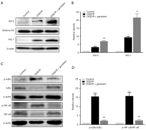 Western blot assays were also performed to explore whether genistein protected against OGD/R-induced neuronal cell injury by regulating the Nrf2/HO-1 and NF-κB pathways. As indicated in Figure 7A-7D, consistent with our in vivo data, the levels of Nrf2 (nuclear fraction) and HO-1 (cytosolic fraction) and the ratios of p-NF-κB/NF-κB and p-IκB/IκB were noticeably increased in OGD/R-treated primary cortical neurons. However, these OGD/R-induced changes were significantly reversed by genistein treatment. Thus, genistein attenuates OGD/R-induced injury in treated primary cortical neurons by modulating the Nrf2/HO-1 and NF-κB pathways.