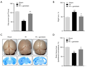 We then explored whether genistein improved long-term neurological performance 3 weeks after HI. In the grip strength test, a significant reduction in the grip strength of the contralateral forelimb was observed in the HI group compared with that obtained in the sham group (Figure 3A; P<0.001). However, genistein administration significantly ameliorated this change. In addition, compared with the HI group, the percentage of right turns was decreased in the HI + genistein group (Figure 3B; P<0.01). Furthermore, Figure 3C shows that no brain tissue loss occurred in the sham group, while different levels of brain tissue loss were observed in the other 2 groups. Nissl staining revealed extensive cerebral atrophy and damage to the ipsilateral hemisphere in the HI group, which was attenuated in the genistein-treated group. Moreover, genistein also increased the mass ratio of the ipsilateral/contralateral hemispheres compared with the HI group (Figure 3D; P<0.01). Based on these findings, genistein also provides long-term protection in neonatal mice following HIBD.