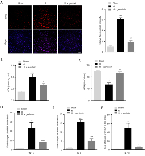 As shown in Figure 4A, the superoxide level was measured using DHE staining, and a few DHE-positive cells were observed in the ipsilateral parietal cortex of the sham group, probably due to the physiological level of superoxide. A marked increase in red fluorescence was detected in the ipsilateral parietal cortex of the HI group (P<0.001). However, genistein treatment significantly suppressed superoxide production (P<0.001). In addition, the levels of the antioxidant GSH and lipid peroxidation product MDA were determined. HI significantly decreased the GSH content while increasing the MDA concentration. However, these changes were reversed by the genistein intervention (Figure 4B,4C). We also explored the effect of genistein on the inflammatory response following neonatal HIBD. RT-qPCR analysis revealed that the levels of proinflammatory markers (TNF-α, IL-1β, and IL-6) were significantly increased in the HI group compared to the sham group. However, genistein treatment reduced the levels of these factors (Figure 4D-4F). Overall, genistein exerts an inhibitory effect on HIBD-induced oxidative damage and acute inflammation.