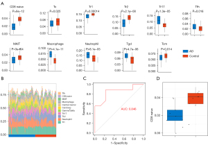 ImmuCellAI was used to predict the patient's response to immune checkpoint blockade therapy. This tool is based on gene set characteristics and is used to accurately assess the abundance and difference in the penetration of 24 immune cells from gene microarrays (18). This tool was used to analyze the immune infiltration of the DEmRNAs in the GSE122063 and GSE150696 datasets to identify key immune cells associated with AD. The former is the training set and the latter is the validation set. The receiver operating characteristic (ROC) curves were used for verification, and an area under the curve (AUC) value greater than 0.8 was set as the threshold (19).