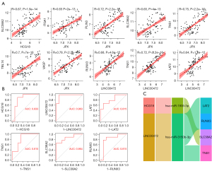 Pearson correlation analysis was used to calculate the correlation between the cell infiltration value of key immune cells and the expression value of mRNAs and lncRNAs in the ceRNA. The ceRNA sub-network was constructed based on the correlation coefficient |R| >0.5 and P value <0.05. The correlation coefficient between the expression values of lncRNAs and mRNAs in the sub-network was calculated and R>0.5 was set as the threshold. Finally, the ROC curve of the network was verified through the GSE150696 dataset to finalize the network.