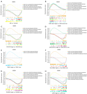 GSEA was applied to the GSE122063 dataset to clarify the regulatory pathways of the core prognostic factors. Median grouping of lncRNA LINC00472 and lncRNA HCG18, RUNX3, TNS1, LAT2, SLC38A2, and naïve CD8 immune infiltration score was performed. In addition, analyses were also grouped according to AD samples and control samples. The results suggested that the ceRNA sub-network may regulate the progression of AD by regulating the calcium signaling pathway; the NOD-like receptor signaling pathway; the toll-like receptor (TLR) signaling pathway; the B cell receptor signaling pathway; and the JAK-STAT signaling pathway (Figure 8).