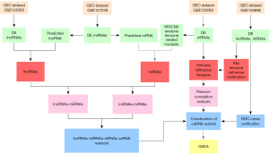 The detailed mechanisms of immune regulation in AD remains unclear and the immunomodulatory effect of ceRNA in the development of AD has not been fully elucidated. To the best of our knowledge, this study is the first to report the molecular mechanisms of ceRNA immunoregulation during the progression of AD. This study not only identified the ceRNA network related to AD immunity, but also identified the key immune cells related to AD, and we also conducted correlation analysis on immune cells and ceRNA. These insights contribute to the identification and development of potential AD biomarkers and therapeutic targets. The research process is shown in Figure 1.