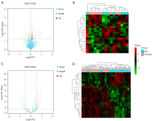 The GEO2R tool was used to analyze the differences between the microarray datasets GSE122063, GSE157239, and GSE150696. A total of 188 AD-related DEmiRNAs were identified, including 95 that were upregulated and 93 that were downregulated (Figure 2A,2B). In addition, 105 DElncRNAs were identified from the GSE122063 dataset (Figure 2C,2D). Furthermore, 9,528 DEmRNAs were identified from the GSE122063 dataset.
