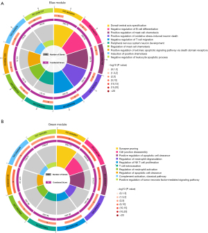 The WGCNA algorithm was used to segment the AD samples and the control samples. Based on the scale-free topology with R2=0.85, the Pearson correlation matrix of the gene was transformed into a strengthened adjacency matrix according to the power of r=16 (Figure 3A,3B). Use the topological overlap matrix (TOM)-based dissimilarity measurement method to cluster all selected genes, the tree was divided into seven modules with different colors according to the dynamic tree cutting algorithm (Figure 3C). The relationship between each module and its respective clinical features was computed and graphed (Figure 3D). The Enrichr tool was used to perform enrichment analysis on each module, and the top ten GO biological processes were selected based on the combined scores for ranking. The results showed that the processes involved in the blue module included negative regulation of B cell differentiation (GO-0045578); negative regulation of T cell migration (GO-2000405); positive regulation of oxidative stress-induced neuron death (GO-1903223); regulation of mast cell chemotaxis (GO-0060753); and negative regulation of leukocyte apoptotic process (GO-2000107) (Figure 4A). In addition, processes in the green module included positive regulation of tumor necrosis factor-mediated signaling pathway (GO-1903265); regulation of neutrophil activation (GO-1902563); regulation of neutrophil degranulation (GO-0043313); regulation of NK T cell proliferation (GO-0051140); and T cell extravasation (GO-0072683) (Figure 4B). Therefore, the blue module and the green module are immune-related modules.