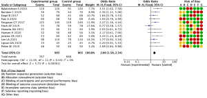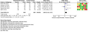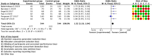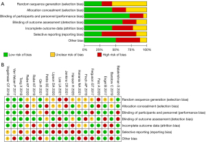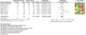 Studies included in the meta-analysis were reviewed by a third person using the complete RCTs bias evaluation system from the Cochrane 5.1.0 system evaluation manual. The bias risk assessment examined the following components of each study: whether the method was random, the allocation scheme, blindness, lost visit and exit, whether the study contained selective reports of study results, and another six risk evaluation criteria (Figures 1,2).