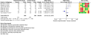 A total of 6 studies were included, and the heterogeneity (I2=74%) was analyzed using fixed effect model. The improvement of the CAT score in the glucocorticoid combined with antibiotic treatment group was better than that in the control group, and the difference was statistically significant (OR =1.53; 95% CI: 1.13–2.07; P=0.006) (Figure 9).