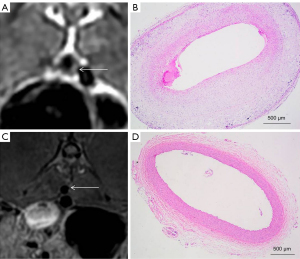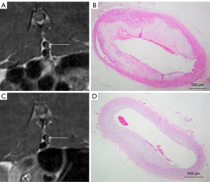 Vessel wall magnetic resonance imaging (VWMRI) is currently one of the best imaging techniques for the non-invasive evaluation of intracranial atherosclerotic lesions (5). VWMRI had high spatial resolution and could directly image the vessel wall and lumen by suppressing blood signals, and it can identify distinct morphologic and enhancement patterns of atherosclerosis to provide important information about ischemic stroke etiology (6). The current expert consensus on technical specifications for VWMRI includes (I) high spatial resolution; (II) multiplanar 2D and 3D imaging; (III) multiple tissue-weighted sequences; (IV) suppression of blood and cerebrospinal fluid (7). VWMRI of intracranial atherosclerotic plaque typically demonstrates arterial wall thickening. However, as it is still impossible to obtain pathological specimens of intracranial atherosclerotic plaques in vivo, there is a lack of pathological findings to support intracranial arterial plaque images (8). The establishment of experimental animal models of atherosclerotic lesions similar to those of humans could solve this deficiency.