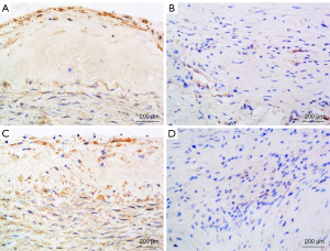 The immunohistochemistry results also showed that macrophages and neovascularization gradually appeared in the rabbit abdominal aortic plaques following prolonged feeding on a high-fat diet. The new microvasculature was present in the fibrous cap on the plaque surface, at the base of the plaques, and partially in the lipid core. The macrophages were mainly clustered in the lipid core of the plaques (see Figure 3).