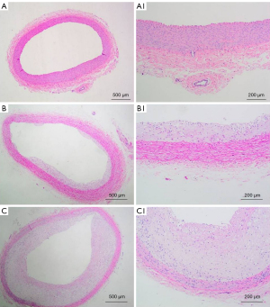 Additionally, 4 consecutive specimen segments of abdominal aortic lesions were removed from the rabbits with the left renal artery as the reference point, and the images of the pathological sections were counted and measured using Image J (version 1.53e, National Institutes of Health, USA). The pathological section was independently measured and evaluated by 2 doctors using a blinded method.