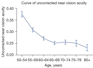 The mean UNVA in residents gradually decreased with age (Figure 1). There was a significant decrease in UNVA from age 50 to 65 (P=0.000). The mean UNVA then plateaued at approximately 0.25 between 65 and 80 years old. After age 80, the loss of UNVA increased again (P=0.015).