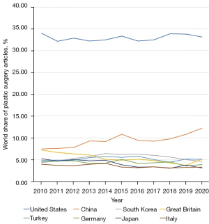 The Clarivate Analytics 2020 Journal Citation Reports (JCR) was used to identify the major journals within the field of plastic surgery; we also referred to the journals listed in a study by Asaad et al. (9). A total of 35 journals were selected for our bibliometric analysis (Table 1). On 26 February, 2021, we searched the Web of Science to access all articles from these journals that had been published between 1 January, 2010 and 31 December, 2020, using the International Standard Serial Number (ISSN) of the printed editions for the search. The country of origin for each article was determined based on the corresponding author’s affiliation. All original articles from the 8 countries with the most publications, namely, the United States, China, South Korea, Great Britain, Turkey, Germany, Japan, and Italy, were analyzed. Any publications categorized as letters, editorials, corrections, biographical items, news items, book reviews, early access, retractions, or meeting abstracts were excluded.