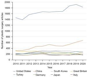 Over the past decade, the quality of articles contributed by plastic surgeons to plastic surgery journals has significantly increased (1). There is considerable variation in the distribution of contributing countries to some prestigious plastic surgery journals (2,3). China has invested much in biomedical research and development (R&D), leading to developments in various surgical specialties in the past years (4-7). Studies have revealed that during the 2000’s, articles from China increased markedly in the field of plastic surgery, yet the publications remained of a lower quality compared to those from other top-ranking countries (7,8). However, a bibliometric analysis has not been conducted recently to elucidate the progress and current state of plastic surgery research.