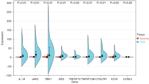 To further investigate the actual expression level of nine optimal IRGs (IL-18, JAK2, TBK1, EED, TNFSF10, TNFSF13B, CYSLTR1, ICOS, and CCRL2) in whole blood cells between pSS patients and healthy volunteers, we determined the gene expression in whole blood cells of pSS patients and healthy volunteers by quantitative real-time PCR (qRT-PCR). The results of the violin plot showed that the expression of eight of the nine genes was in accord with the predicted results, and all of them were upregulated (Figure 6). These eight optimal IRGs were defined as key genes (IL-18, JAK2, TBK1, EED, TNFSF10, TNFSF13B, CYSLTR1, and ICOS).