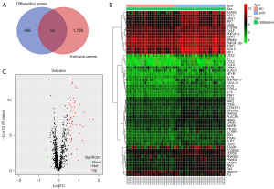 The gene expression matrices were obtained by R software (version 3.6.3; https://www.r-project.org/), and the “Bioconductor” R package (http://www.bioconductor.org/) was used for the data analyses. The linear models for the microarray data (LIMMA; https://www.bioconductor.org/packages/release/bioc/html/limma.html) package in “Bioconductor” was applied to screen the differentially expressed genes (DEGs). Only genes that met the cut-off value of P<0.05 and fold change (FC) =1.5 (|log2FC| ≥0.5) were chosen as DEGs. Differentially expressed immune-related genes (DEIRGs) were acquired by matching 1,793 immune-related genes (IRGs) from the ImmPort database (https://www.immport.org/shared/genelists) IRG dataset to DEGs using Venn online software (http://bioinformatics.psb.ugent.be/webtools/Venn/) (19). The heatmap for the DEIRGs was constructed with the “heatmap” package in R software (https://bioconductor.org/packages/release/bioc/html/heatmaps.html). The volcano map of DEIRGs was created to show the differential expression by using the “ggplot2” package (20,21).