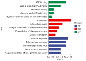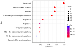 All DEIRGs were uploaded to the online software DAVID to identify the GO categories. The different GO classification and expression changes of the DEIRGs impacted the results of the GO enrichment analysis terms (Figure 3). “Immune response”, “inflammatory response”, “defense response to virus”, “innate immune response”, and “negative regulation of viral genome replication” exhibited highly significant enrichment within the GO BP category. For the CC category, DEIRGs were significantly enriched mostly in “cytoplasm”, “extracellular space”, “integral component of plasma membrane”, “external side of plasma membrane”, and “extracellular region”. In the MF category, DEIRGs were significantly enriched in “ATP binding”, “double-stranded RNA binding”, “chemokine activity”, “single-stranded RNA binding”, and “hydrolase activity, acting on acid anhydrides”. KEGG pathway enrichment analysis was used to clarify the signaling pathway enrichment of DEIRGs (Figure 4). With P<0.05, the top enriched biological pathways of pSS included “Influenza A”, “Herpes simplex infection”, “Measles”, “Cytokine-cytokine receptor interaction”, “Hepatitis B”, “Hepatitis C”, “TNF signaling pathway”, “RIG-I-like receptor signaling pathway”, “Toll-like receptor signaling pathway”, and “Cytosolic DNA-sensing pathway” (14).
