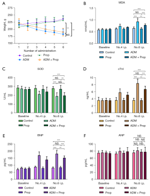 At baseline, the serum levels of SOD, MDA, ANP, BNP and cTnI were not statistically significant among the different groups. Compared with the control group, the concentrations of MDA, cTnI and BNP in both the ADM and ADM + Prop group were significantly higher after 6 cycles of injections. When compared with the ADM group, the levels of MDA, cTnI and BNP in the ADM + Prop group were significantly decreased (P=0.0033, 0.0014 and 0.0029 for MDA, cTnI and BNP respectively). Compared with the control group, the levels of SOD in the ADM and ADM + Prop groups were deceased (P<0.0001) and there was no significant difference between the ADM and ADM + Prop groups (P=0.6694) (Figure 1B-1E). For the serum ANP levels, there was no significant difference observed among the 4 different groups (Figure 1F).