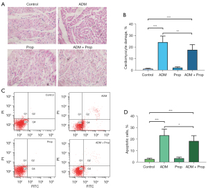 In order to define whether propofol protected against apoptosis of myocardial cells, the proportion of apoptotic cells in the different treatment groups as analyzed by flow cytometry (Figure 2C). The ratio of apoptotic cells was significantly upregulated to 23.3%±5.3% in the ADM group compared with 2.7%±0.75% in the Control group (P<0.0001). A significantly greater decrease in apoptosis in the combination treatment group compared with the ADM group (P=0.0388) (Figure 2D) was observed, which suggested that propofol had reduced the ADM-induced apoptosis of cardiomyocyte in vivo.