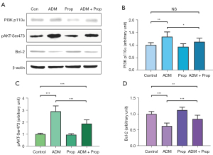 In summary, our study results suggest that the protective role of propofol on cardiomyocyte apoptosis induced by ADM involves suppressing the activation of the PI3K/AKT/Bcl-2 pathway.