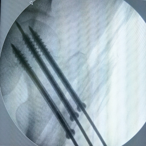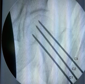 Our localization method for guide pin insertion points has many advantages. Firstly, the lower guide pin insertion point was based on the distance between the apex and the highest lateral point of the greater trochanter, measured by the anteroposterior radiographs. This method locates the guide pin insertion points quite precisely and avoids the impact of the patient’s personal characteristics. Secondly, the distance between the upper two guide pins and between the upper and lower guide pins was measured by the lateral radiographs. These two distances are both 1 cm. The three guide pins should be placed close to the posteroposterior cortical bone, the superoanterior cortical bone, and the inferior cortical bone of the femoral neck in proper sequence. They are distributed in the shape of an inverted isosceles triangle and parallel to each other. Biomechanical experiments have shown that this distribution provides a stronger biomechanical effect, better torsional and anti-rotational effects, and greater axial stiffness and axial failure load (25). Thirdly, the guide pins were uniformly distributed in the femoral neck, and the distance between them is large enough using our localization method. It can significantly decrease the incidence of complications, such as nonunion and necrosis of the femoral head (8,26).