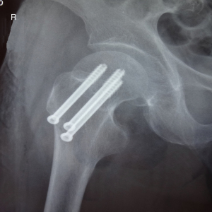 Closed reduction surgery is a well-established and widely used clinical treatment for femoral neck fracture. We performed closed reduction based on the principle of traction along the limb’s vertical axis with reduction to reverse the trauma mechanism. Then, Garden’s alignment index (16) was used to evaluate the reduction quality, where grade I was optimal, grade II was acceptable, and grades III and IV were considered failures. Lastly, many scholars (10,17) have emphasized the importance of the selection and placement of the internal fixators in stabilizing femoral neck fractures. To avoid overdrilling, internal fixation using three parallel cannulated screws placed in an inverted triangle configuration was implemented in our study. This screw configuration can sustain high shearing stress, provide bending resistance and anti-torsional strength, and withstand greater axial stress. Furthermore, the incidence of complications such as subtrochanteric fracture, nonunion, and osteonecrosis of the femoral head is very low using this configuration. Additionally, after much discussion and biomechanical experiments, this configuration shows a good biomechanical effect (9,10,18,19). Thus, it has been widely implemented in clinical practice. We also used this screw configuration and gained a satisfactory curative outcome in our clinical treatment.