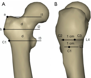Firstly, we determined the apex point (a) and the highest lateral point (b) of the greater trochanter by palpating the hip. Two horizontal lines (l1 and l2) with a vertical distance of (d) were drawn through points (a) and (b) using the guidance of the anteroposterior radiographs. The horizontal line l3 was then drawn with a vertical distance of (d) from point (b). The intersection point (C1) of line l3 and the lateral cortex of the proximal femoral head was the lower guide pin insertion point (Figure 1A). Because the guide pin must penetrate the skin and soft tissue to arrive at point C1, and the direction of the guide pin is parallel to the femoral neck with anteversion of the guide pin controlled at about 10 degrees, the thickness of the soft tissue should be considered when determining the guide pin insertion point on the skin, which should be lower than point C1. Lastly, we placed the guide pin close to the inferior cortical bone of the femoral neck, penetrating through the femoral calcar and compression trabeculae to the cortical bone of the femoral head. For the convenience of manipulation and before fluoroscopy, a Kirschner wire was placed on the front of the hip and located at the central axis of the femoral neck in accordance with the above requirements. The position of the Kirschner wire was adjusted according to the fluoro-images.