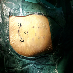 Three guide pins were implanted at points C1, C2, and C3, parallel to the direction of the femoral neck. The distance between the anterior end of the guide pins and the cortical bone of the femoral head was approximately 5–10 mm. Three 0.5 cm guide pin-centric skin incisions were made carefully. Finally, three cannulated screws of moderate length were implanted along the guide pins at a 110-degree neck-shaft angle. The screw position was evaluated to determine correct parallelism and positioning in the femoral head and neck. The three cannulated screws should pass through the fracture line simultaneously to gain the dynamic compression needed to reduce the gap at the fracture site and enhance stability.