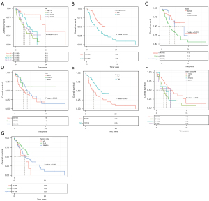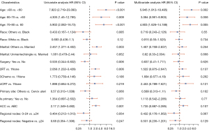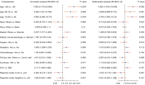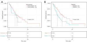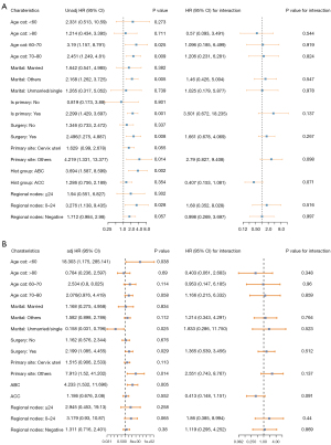To further determine the effects of Chemo/RT/CRT vs. none on various subgroups, we also performed a subgroup analysis. As shown in Figure 3A, Chemo/RT/CRT in age 60–70 years (HR =3.19, 95% CI: 1.157–8.791, P=0.025), age 70–80 years (HR =2.451, 95% CI: 1.249–4.81, P=0.009), marital status other (HR =2.168, 95% CI: 1.262–3.725, P=0.005), primary tumor (HR =2.299, 95% CI: 1.429–3.697, P=0.001), surgery (HR =2.496, 95% CI: 1.275–4.887, P=0.008), ABC histology group (HR =3.694, 95% CI: 1.587–8.599, P=0.002), and regional nodes 0–24 (HR =3.276, 95% CI: 1.138–9.435, P=0.028) were found to be associated with a higher risk of mortality. These variables were further studied by multivariate analysis (Figure 3B). Overall, patients in surgery, primary tumor: others and ABC subgroup received Chemo/RT/CRT with a poor prognosis. There were no meaningful interactions between the above 3 subgroups given the non-significant p values for interaction (Figure 3A,3B).