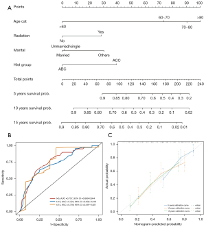 In general, there were too few patients in the Chemo/RT/CRT groups to conduct further analyses. To further evaluate and test the survival assessment model, we performed KM survival analysis according to whether the patient underwent Chemo/RT in enrolled patients. We found that there was no statistically significant difference between patients who received Chemo and those who did not (Figure 5A, P=0.187). Survival analysis was also performed in 131 patients (no radiation) and 35 patients who received radiation. The OS for patients without radiation was better than for those who received radiation (Figure 5B, P=0.005). Figure 6 shows the univariate and multivariate analyses of potential predictors for OS. Each variable satisfied the Ph test (Figure S3). Age >80 years, age 60–70 years, age 70–80 years, marital status at diagnosis (marital: others), surgery, radiation, and histological group were significantly associated as risk factors for OS in the univariate analysis. Therefore, these significant risk factors were included in the multivariate analysis. Multivariate analysis identified that only race, age >80 years, and age 70–80 years were independently able to predict survival (Figure 6). Based on the multivariate Cox models, 4 variables (age, marital status, radiation, and histological group) were finally included in the prediction model (Figure S4), and the prognostic nomogram was constructed, which could predict the 5-, 10-, and 15-year OS probability of patients with ABC and ACC (Figure 7A). In terms of model diagnosis, the sensitivity and specificity of predicting the prognosis of ABC and ACC were identified by time-dependent ROC curves. The AUC values of the nomogram in predicting OS are displayed in Figure 7B. In addition, the calibration curves demonstrated that the nomograms had a high degree of reliability owing to the minor deviations from the reference line (Figure 7C).