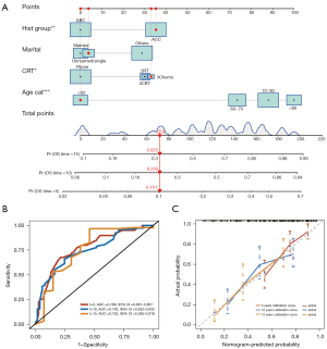 The outcome of interest of our study used for comparison was overall survival (OS), measured in months. OS was used as the event because this is the survival metric used by the AJCC and avoids potential bias from attribution of the cause of death. In our study, the clinical and pathological characteristics of the training and validation sets were compared between the live and death groups using Pearson’s chi squared test for categorical variables. We also constructed univariate and multivariate Cox proportional hazards models to identify the prognostic value of patient characteristics and treatment use. All variables with P value <0.05 were included in the final multivariate model and were considered statistically significant. The Kaplan-Meier (KM) technique was used to evaluate OS. Next, we defined the predicted probability of treatment as a propensity score to balance the clinicopathological factors between the patients in the SEER cohort. All independent prognostic factors were recruited into the construction of the nomograms. Based on the variables of importance score, the final variables were included in the prediction model. The nomogram predicted the 5-, 10-, and 15-year survival probability with the observed mortality and survival rates. The model performance for predicting the survival outcomes was evaluated by time-dependent receiver operating characteristic (ROC) curves and the C-index, and the brier score was used to calculate the relevant parameters of 5, 10, and 15 years.