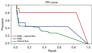 Figure 5 shows the effect of different model components with the area under the PR curve as AP. It suggested that a single RGB or a single optical flow map resulted in low AP, but combining RGB and optical flow map could lead to significant improvements. As shown in Table 1, the model combining RGB and optical flow performed well on all 3 indicators (AP, RR, PR). We set the threshold to 0.7 to calculate RR and PR, showing that the recall rate was also good under high precision conditions.