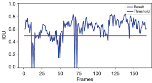 To more intuitively visualize detection results in video sequences, the IOU was applied to objectively evaluate detection performance in videos. The IOU is defined as the overlap ratio between the predicted and ground-truth boxes. We set the threshold to 0.5 to explore detection accuracy. As shown in Figure 6, most frame IOUs were over 0.5 and around 0.7, indicating good detection results. Interested readers can find the corresponding videos in a supplementary appendix online, and Videos 1,2 show how our method performed in bleeding point detection.