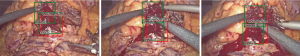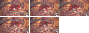 To acquire better performance and avoid being trapped in overfitting situation, large quantities of data were needed to train the deep learning model. We selected 12 bleeding video clips from 10 laparoscopic surgeries conducted at Peking Union Medical College Hospital, and sample images were extracted from the clips at 25 frames per second (fps). Finally, we obtained 2,665 images with 1,920×1,080 pixels, and 1,339 of them contained bleeding events. The ground-truth areas of bleeding point were marked by 2 senior surgeons using the visual object tagging tool (VoTT; Microsoft, Redmond, WA, USA) (9), and the center of marked box was regarded as the bleeding point. A more accurate point between the 2 marked centers was chosen as the picked point, and a 400×400 pixels box centered on the picked point was generated as the ground-truth.