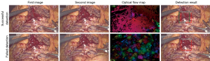 Challenges arose at the very beginning of the first step. In the spatial dimension, point-like blood could be clearly defined, but it was difficult to define the event bleeding in the spatial dimension. Specifically, we might have been able to judge whether there was blood based on an image, but it was difficult to accurately assess whether there was an active bleeding event according to a single image. Therefore, we inferred that temporal dimension information should be considered at the same time. Looking forward (the previous image) or backward (the next image) was needed to help further assess whether the blood area had changed or not. In general, active bleeding would be characterized by increasing area of blood. Thus, spatial and temporal features were required to be analyzed simultaneously. In this study, we introduced optical flow to extract temporal features as well as the faster region-based convolutional neural network (RCNN) for spatial features, and consequently a spatiotemporal hybrid model was developed based on the faster RCNN to locate bleeding points (8). We present the following article in accordance with the MDAR reporting checklist (available at https://atm.amegroups.com/article/view/10.21037/atm-22-1914/rc).