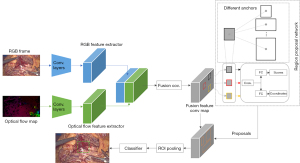 As shown in Figure 3, our model is derived from the extension of faster RCNN with optical flow input, which takes as input an RGB frame and an optical flow map extracted from the same frame and its adjacent frame. In particular, optical flow map only has 2 channels and our next feature extractor accepts 3 channels of input, so we transformed the optical flow map to 3 channels by stacking the x-component, the y-component, and the magnitude of the flow (15). In addition, the RGB feature extractor and the optical flow feature extractor were set up. For these 2 feature extractors, we fine-tuned the VGG-16 model pretrained on the ImageNet dataset and intercepted the first 30 layers for further use (16,17). After feature extraction, we stacked the RGB feature map and optical flow feature map we obtained as input, and used a 1×1 convolution kernel to keep the original HW constant, only halving the number of channels. The RPN operated on fusion convolution feature maps. Several rectangular anchors of different sizes were determined at each location of the fusion convolutional feature map. These anchor features were then input to 2 fully connected layers after a layer of convolution, 1 for object classification and the other for coordinate prediction. Finally, we obtained the required proposals and applied them to the fusion convolutional feature maps. After ROI pooling and classifier, we found the bleeding points. It is worth mentioning that the classifier was identical to the RCNN. The difference is that we only focused on the bleeding points, and the classifier further corrected the detection results. It can be seen as an improvement on the RPN results in this case, and we adopted the same loss function as faster RCNN in this work to optimize model parameters.