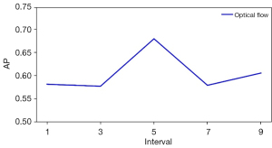 Optical flow was determined from 2 images. In our video sequence, different frame rates could be used to obtain different next frame images. To investigate the effect of downsampling at different frame rates on performance, we selected previous image frames 1, 3, 5, and 10 to estimate the optical flow of the current image frame, respectively. Our data was sampled from the videos according to 25 fps. The previous image frame 5 means 5 fps and everything else is as follows. As shown in Figure 4, the best results were obtained when we sampled at 5 fps. Optical flow calculations in the following experiments were all based on this sampling.