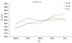 The simulation results demonstrated that shortening the preparation time by a TRIA of {0, 15, 30} decreased both the T and TCT. When λo=3, λc≥50 or λo=5, λc≥60, as the preparation time was shortened, TCT and T both decreased. When λc was small, the preparation time TRIA, TCT decreased, and T appeared to increase slightly (Table 1).