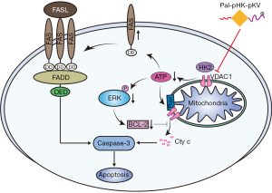 VDAC1 is in the outer membrane of mitochondria, which allows for free shuttling of ATP from mitochondria to the cytosol and plays an important role in energy metabolism and energy balance (14). VDAC1 can also promote apoptosis mediated by mitochondria. A previous study showed that the metabolite exchange between the cytosol and mitochondria was decreased following the down-regulated expression of VDAC1, and as a result, cell growth was also inhibited (30). In the present study, we found that the production of ATP decreased with Pal-pHK-pKV and pHK-pKV treatment. The decrease of ATP in the cytosol then inhibited the downstream ERK signalling pathway, disrupted the BAX/BCL-2 balance in the outer membrane of the mitochondria, and induced cytochrome c release from mitochondria. Some studies have shown that ATP can activate the ERK signalling pathway (31), and ERK activation results in up-regulation of BCL-2 and cell survival (32). ATP can also promote cell survival via down-regulation of the BAX/BCL-2 ratio (33). Hence, decreased ATP in Pal-pHK-pKV and pHK-pKV-treated cells results in the release of cytochrome c via inhibition of the ERK pathway. In addition, it can also lead to an increased BAX/BCL-2 ratio and induce cell apoptosis. On the other hand, decreased ATP can induce apoptosis via an extrinsic pathway. A previous study showed that the FAS, FAS ligand, and FAS-associating protein with death domain (FADD) increased significantly in ATP-depleted canine kidney cells (34). Consistent with this, we found the FAS mRNA expression increased with Pal-pHK-pKV and pHK-pKV treatment. So, the mitochondria-specific peptides, Pal-pHK-pKV and pHK-pKV, targeted the interaction between VDAC1-HKII and inhibited the shuttle of ATP from mitochondria to the cytosol. The decreased ATP level in cytosol then inhibited the ERK/BCL-2 pathway and increased the BAX/BCL-2 ratio, resulting in the release of cytochrome c and the initiation of apoptosis through an intrinsic pathway. At the same time, Pal-pHK-pKV and pHK-pKV also initiated apoptosis through an extrinsic pathway by upregulating FAS. In summary, Pal-pHK-pKV and pHK-pKV inhibited the cell growth and exerted anti-tumor activity in PTCL (Figure 5).