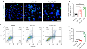 Compared to the control group, the cleaved caspase-3-positive cells detected by immunofluorescence staining increased in the pHK-pKV group and obviously increased in the Pal-pHK-pKV group (Figure 2A,2B). Furthermore, the number of apoptotic cells was calculated by flow cytometry analysis. The result showed that the apoptotic cell ratio in the pHK-pKV group was higher than that in the control group and even more significantly higher in the Pal-pHK-pKV group (Figure 2C,2D). Taken together, these results indicated that Pal-pHK-pKV and pHK-pKV both induced H9 cell apoptosis, and Pal-pHK-pKV induced cell apoptosis to a greater degree than pHK-pKV.