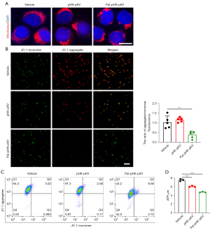 To further explore the roles of Pal-pHK-pKV and pHK-pKV on mitochondrial function, mitochondrial membrane potential (MMP) was measured through confocal microscopy and flow cytometry using JC-1. The results showed Pal-pHK-pKV significantly induced MMP dysfunction, but pHK-pKV only slightly influenced MMP (Figure 3B,3C). At the same time, Pal-pHK-pKV and pHK-pKV induced the decrease of ATP production compared to the control cells (Figure 3D).