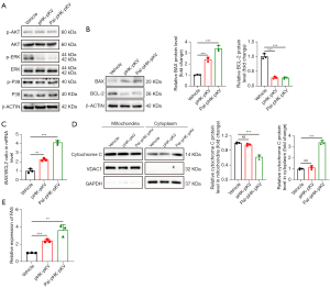 To investigate which signalling pathway was involved in the apoptosis induced by mitochondria-specific peptides, western blot was used to detect the activation of the AKT, ERK, and P38 signal pathways. Interestingly, only phospho-ERK decreased with treatment of Pal-pHK-pKV and pHK-pKV compared with the control group (Figure 4A), which indicates Pal-pHK-pKV and pHK-pKV inhibited the activation of the ERK signalling pathway. In line with the decreased ERK phosphorylation, the expression of BCL-2 decreased and the mRNA and protein expression levels of BAX increased after treatment with Pal-pHK-pKV and pHK-pKV (Figure 4B,4C). Meanwhile, Pal-pHK-pKV and pHK-pKV induced cytochrome c release from mitochondria to the cytoplasm (Figure 4D). Additionally, the relative expression of FAS increased with Pal-pHK-pKV and pHK-pKV treatment, as compared to the control group (Figure 4E).