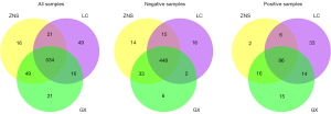 Among 620 suspected pulmonary TB patients, 185 pulmonary TB patients and 435 non-pulmonary TB patients were clinically diagnosed. Among them, 110 cases were CNS-positive (17.7%), 139 cases were Liquid Culture-positive (22.4%), and 131 cases were GeneXpert-positive (21.1%) (Table 2). The cross-coverage relationship of the samples of the 3 methodologies is shown in Figure 1.