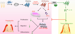 In addition to the important role RSG plays in modulating glycometabolism, the regulatory role of RSG in the local environment has also been verified (24), which is of vital importance to cell functioning (28). A previous study found that RSG significantly reduced mitochondrial swelling and removed the depolarization of mitochondrial membrane potential in high glucose cultured brain cells, resulting in a noticeable reduction of intracellular OS levels (37). Protecting cells from high glucose-induced oxygenation confirms RSG’s beneficial effect in controlling cellular OS. Similar to this result, we also showed a reduction in mitochondrial membrane potential with a relatively low OS level in IR-PDLSCs after RSG treatment; Meanwhile, the expression of proinflammatory factor-like IFN-γ induced by insulin resistance was significantly downregulated while anti-inflammatory factor-like IL-10 was significantly upregulated by RSG, confirming the antioxidant and anti-inflammatory effects of RSG on IR-PDLSCs.