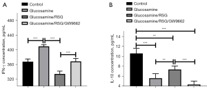 Our results showed that the concentration of inflammatory cytokine IFN-γ was significantly upregulated in the group of IR-PDLSCs with 409.8 pg/mL (P<0.001), while RSG treatment decreased it to a normal level of 334.3 pg/mL(P<0.001) (Figure 3A). Furthermore, the anti-inflammatory factor IL-10 expression in the RSG group was increased compared to the glucosamine group (7.4 vs. 5.6 pg/mL, P<0.01, respectively) (Figure 3B). Additionally, the anti-inflammatory effect of RSG on glucosamine-induced PDLSCs was partly reversed by GW9662, indicating the importance of the RSG PPARγ receptors in modulating inflammatory reactions.