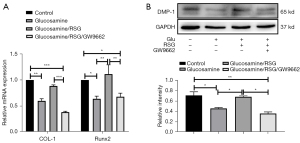 The RT-PCR results showed that glucosamine treatment significantly impaired the expression of the osteogenic differentiation-related genes collagen I (COL-1) and runt-related transcription factor 2 (Runx2) (P<0.01), while RSG treatment partly blocked this side effect with an increased Runx2 expression (P<0.01) (Figure 4A). Consistent with this result, WB results also showed that RSG treatment increased the expression of the odontogenic differentiation-related protein dentin matrix protein 1 (DMP-1) in the IR-PDLSCs (P<0.01) (Figure 4B). All these effects were partly reversed by GW9662, indicating that PPARγ might play a significant role in preserving the multiple differentiation potentials of glucosamine-induced PDLSCs (Figure 5).