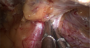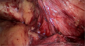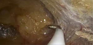 In step 6, the Bogros space is broadened. The outside of the internal inguinal ring is first separated, and then the laparoscopic operating instrument could be inserted into the Bogros space. When separating the right Bogros space, the surgeon uses the electrocoagulation hook in the left hand to operate more smoothly.