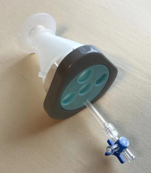 The principal author used a single-hole device named Iconport (Figures 1,2) to close the incisions and complete SILS-TEP through umbilical incision via the posterior rectus abdominis sheath. The Iconport single-hole device is comprised of an operating panel made of medical polypropylene plastic and an incision protective sleeve made of medical silica gel. The two parts were installed through a clamping ring, which can be disassembled and reassembled during surgery to facilitate specimen collection. The incision sealing sleeve, made of medical silica gel, can have a diameter of 1.0, 2.0, 3.0 or 4.0 cm. In general, a diameter of 2.0 cm is selected for SILS-TEP in adults. There are 4 port accesses in the panel for the laparoscopic instruments and the camera. The camera enters through the middle access port. Laparoscopic surgical instruments with diameters of 5 or 10 mm can be interchangeably used with the other port accesses. The study was registered on the Chinese clinical trial registry (Identifier: ChiCTR1900023056).