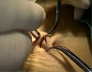 In step 9, the incision is sutured and covered. The linea alba is sutured intermittently with a 2-0 absorbable suture, and the skin is sutured consecutively with 4-0 absorbable sutures (Figure 10). The strips are inserted into the umbilical hole to assist in applying pressure on the incision, and a covering is applied to the incision.