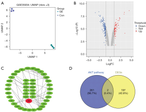 To further clarify the downstream molecules regulated by GE through AKT, we obtained the GSE35934 dataset from the GEO database through bioinformatics analysis. It was mainly used to analyze the mRNA expression changes during GE treatment, and GEO2R was used to obtain differentially expressed genes (Figure 5A,5B). Finally, 76 significantly differentially expressed genes were obtained by setting the threshold. Meanwhile, 326 genes related to the KEGG-AKT pathway were obtained through KEGG analysis. By taking the intersection of Venn diagrams, we obtained 2 differentially expressed downstream proteins of AKT, namely RPRL and JAK2 (Figure 5C,5D). RPRL is mainly related to breast diseases, while JAK2 is related to cell activities such as apoptosis. Therefore, in this study, JAK2 was considered to be a downstream molecule of AKT after GE treatment of high glucose-induced RPE cell damage.