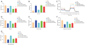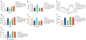 CCK-8 assay results showed that the cell activity was significantly decreased after adding GE and AKT inhibitor (P<0.05). There was no significant decrease in cell activity after adding GE and JAK2 inhibitor. The cell activity was still higher after adding GE combined with AKT inhibitor and JAK2 inhibitor (P<0.05; Figure 6A). RT-PCR results showed that the expression of CYT C1 was significantly decreased after adding GE, though increased after adding GE and AKT inhibitors (P<0.05), and the expression of CYT C1 was significantly decreased compared with that under hyperglycemia after adding GE and JAK2 inhibitor (P<0.05). The expression of CYT C1 was significantly decreased compared with that under hyperglycemia after adding GE combined with AKT inhibitor and JAK2 inhibitor (P<0.05; Figure 6B). The results of energy metabolism analysis showed that the basal respiration rate, maximum respiration capacity, and ATP synthesis capacity of RPE cells were significantly increased after adding GE, and decreased significantly after adding GE and AKT inhibitor (P<0.05). The basal respiration rate, maximum respiration capacity, and ATP synthesis capacity of RPE cells were significantly decreased compared with that under hyperglycemia after adding GE and JAK2 inhibitor (P<0.05), and the same result was also obtained after adding GE combined with AKT inhibitor and JAK2 inhibitor (P<0.05). Mitochondrial permeability was significantly decreased after adding GE (P<0.05), while mitochondrial permeability was significantly increased after adding GE and AKT inhibitor (P<0.05). Mitochondrial permeability was significantly decreased after adding GE and JAK2 inhibitor (P<0.05), and mitochondrial permeability was also significantly decreased (P<0.05) after adding GE combined with AKT inhibitor and JAK2 inhibitor (Figure 6C-6G).